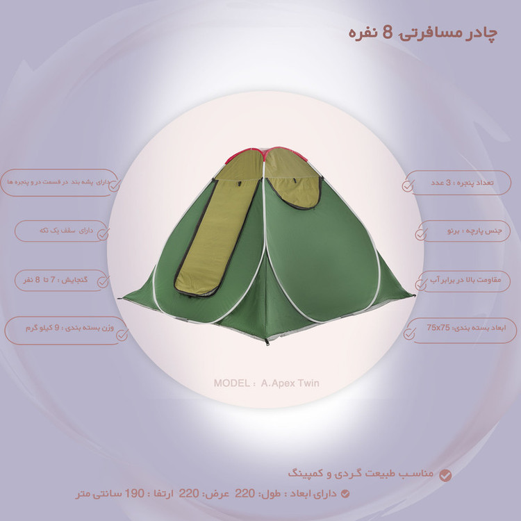 ارتفاع داخلی چادر : 190 سانتیمتر