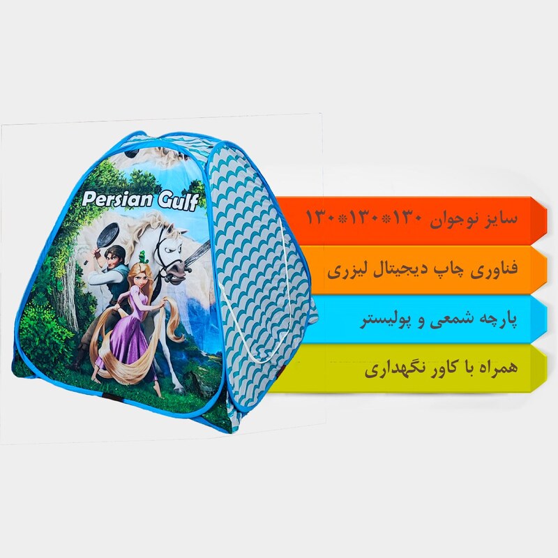 این چادر بازی کودک که سایز بزرگ و یا نوجوان نیز نامیده میشود و ابعاد حدودی آن 130x130x130 سانتی متر هست و برای کودکان تا سنین بالاتر نیز مناسب می باشد. نکته دیگر طرح و رنگ قسمت درب چادر کودک بوده که بصورت رندوم و متنوع میباشد. چادر کودک یکی از بهترین وسیله های بازی برای کودکان هست و آن هارا ساعت ها به بازی و سرگرمی مشغول میکند . چادر های کودک در رنگ و طرح های متنوع و جذاب تولید شده تا دنیای کودکان را زیبا تر کند . برای کودکان از نظر ذهنی بسیار مشغول کننده و باعث افزایش خلاقیت ، شادابی و اعتماد به نفس می شود. از منظر تربیتی می توان کودکان را به حفظ نظم ، پاکیزگی و مسئولیت پذیری تشویق کرد. این محصول با بهره گیری از فناوری چاپ دیجیتال لیزری ، استفاده از پارچه مرغوب شمعی و پولیستر و فنر های مستحکم تهیه شده است . محیط داخل چادر محلی مناسب برای اسباب بازی های کودکان می باشد این محصول با ظاهری زیبا دارای یک درب و پنجره می باشد و همچنین به راحتی در تمامی فضاهای باز و بسته قابل استفاده است همراه این چادر کودک یک عدد کیف برای حمل و نگهداری تقدیم عزیزان می شود.