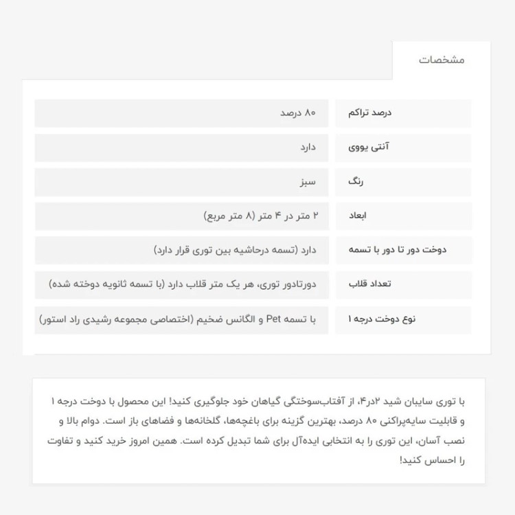 توری سایبان شید، 2در4، با 80 درصد تراکم، انتی یووی دار بوده که از اشعه خطرناک خورشید جلوگیری میکند، دوخت درجه 1 (منظور تسمه و دوخت بسیار قویتر میباشد) ، تسمه محکم دور کار و هر متر یک قلاب با تسمه ثانویه دوخت خورده است، مشخصات کامل محصول در تصویر آخر آمده است. این ابعاد اماده و بسته بندی شده هست، زمان تحویل به پست، تیپاکس، یا پیک بسته به زمان ثبت سفارش، بین 1 تا 3 روز میباشد.