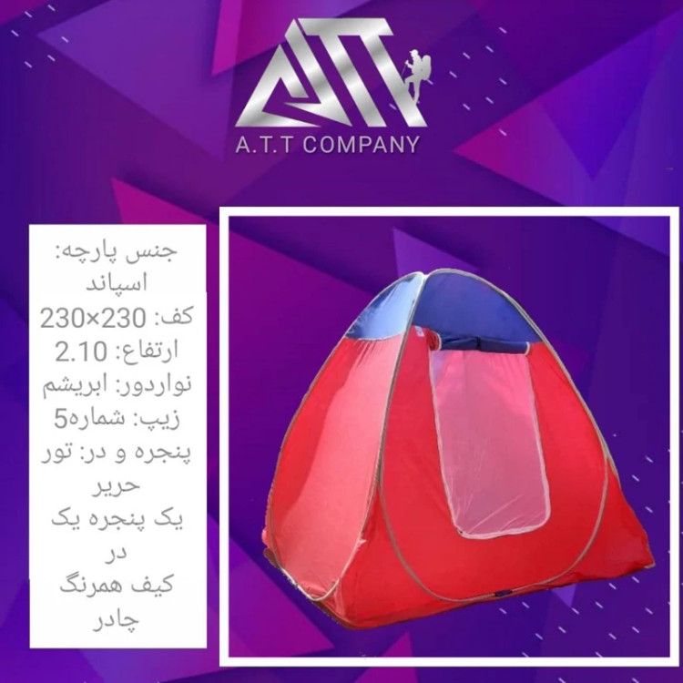 چادر مسافرتی ۸ نفره کف: ۲۳۰×۲۳۰ ارتفاع: ۲۱۰ نوار دور ابریشم . با توری در و پنجره. به همراه کیف مخصوص