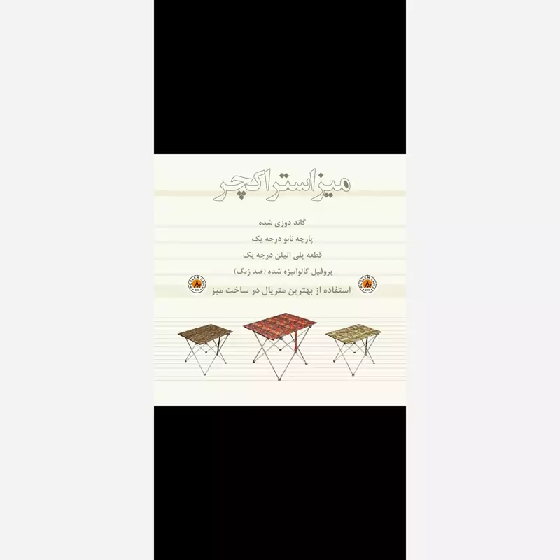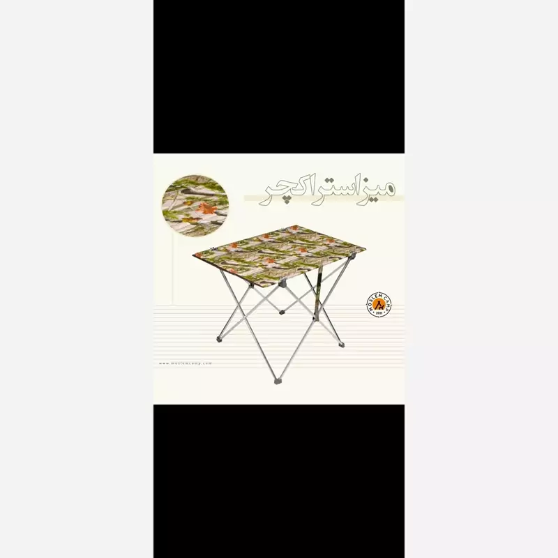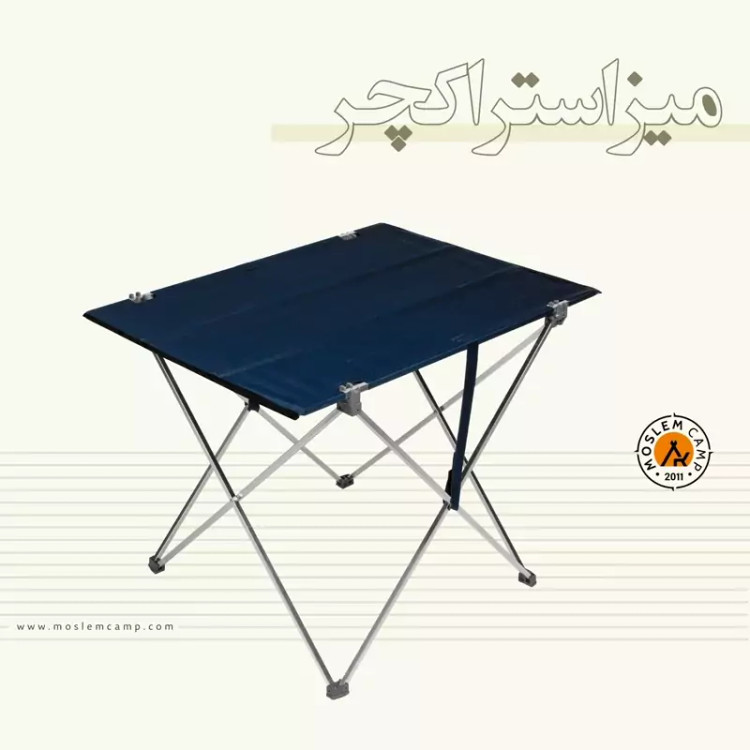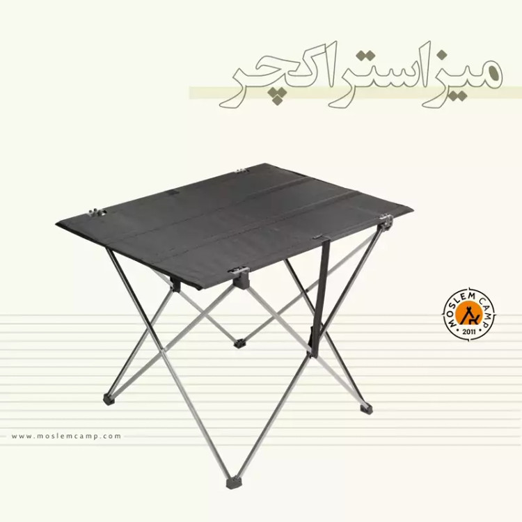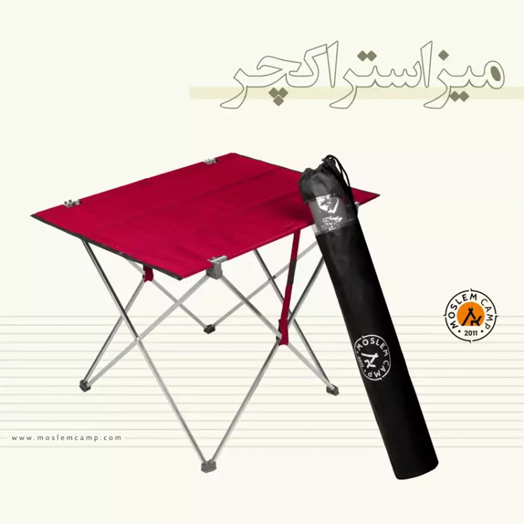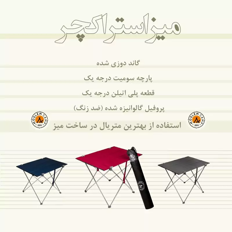 میز استراکچر مسلم کوچکترین و جمع و جورترین میز مسافرتی موجود در ایران محکم و بادوام دارای 4 عدد مسوار قوی در صفحه قطعات پلی اتیلن نشکن صفحه پارچه سومیت درجه 1 به همراه گاند دوزی دارای کاور حمل موجود در رنگ بندی قابلیت ست شدن با صندلی ها چادردوزی امیر نمایندگی فروش محصولات خانه چادر