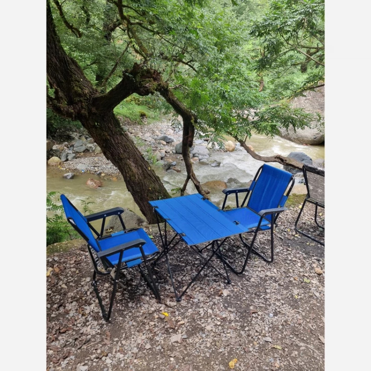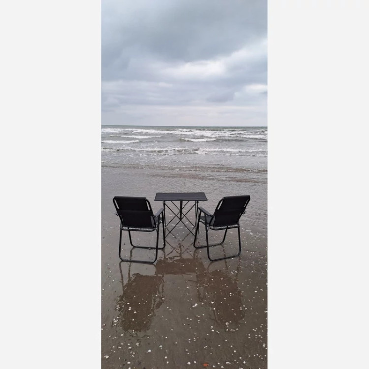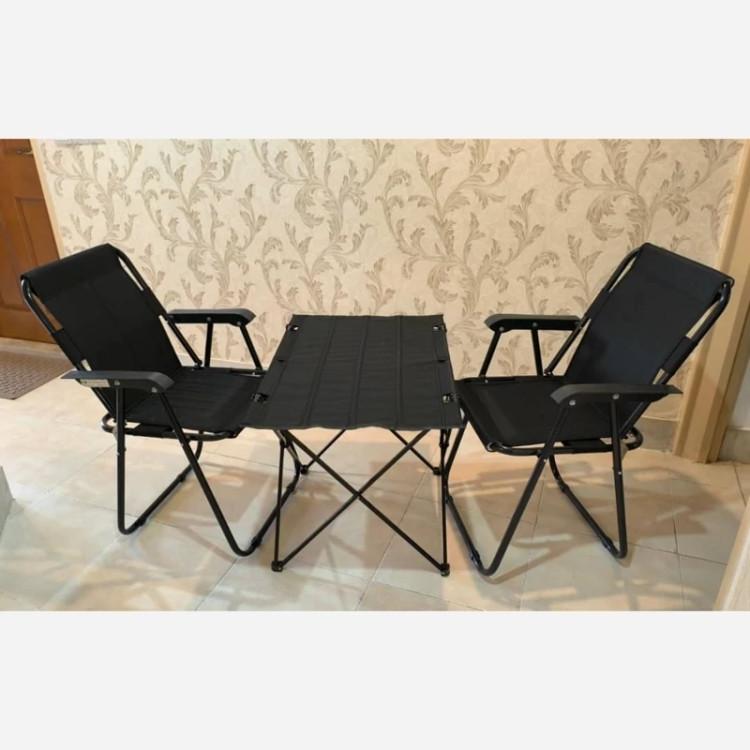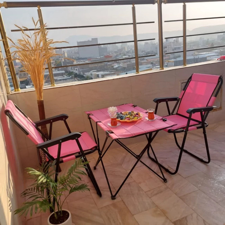 ست دو نفره میز و صندلی تاشو مسافرتی صندلی ها 9 فنره تمام فوم دسته ها نشکن کاملا قابل شستشو به همراه کاور زیپ دار ضخیم قسمت تکیه گاه و زیر نشیمن توسط تسمه برزنتی تقویت شده. برای افزایش مقاومت،برزنت با نوار ضخیم دوردوزی شده. استفاده از لوله محکم و ضخیم