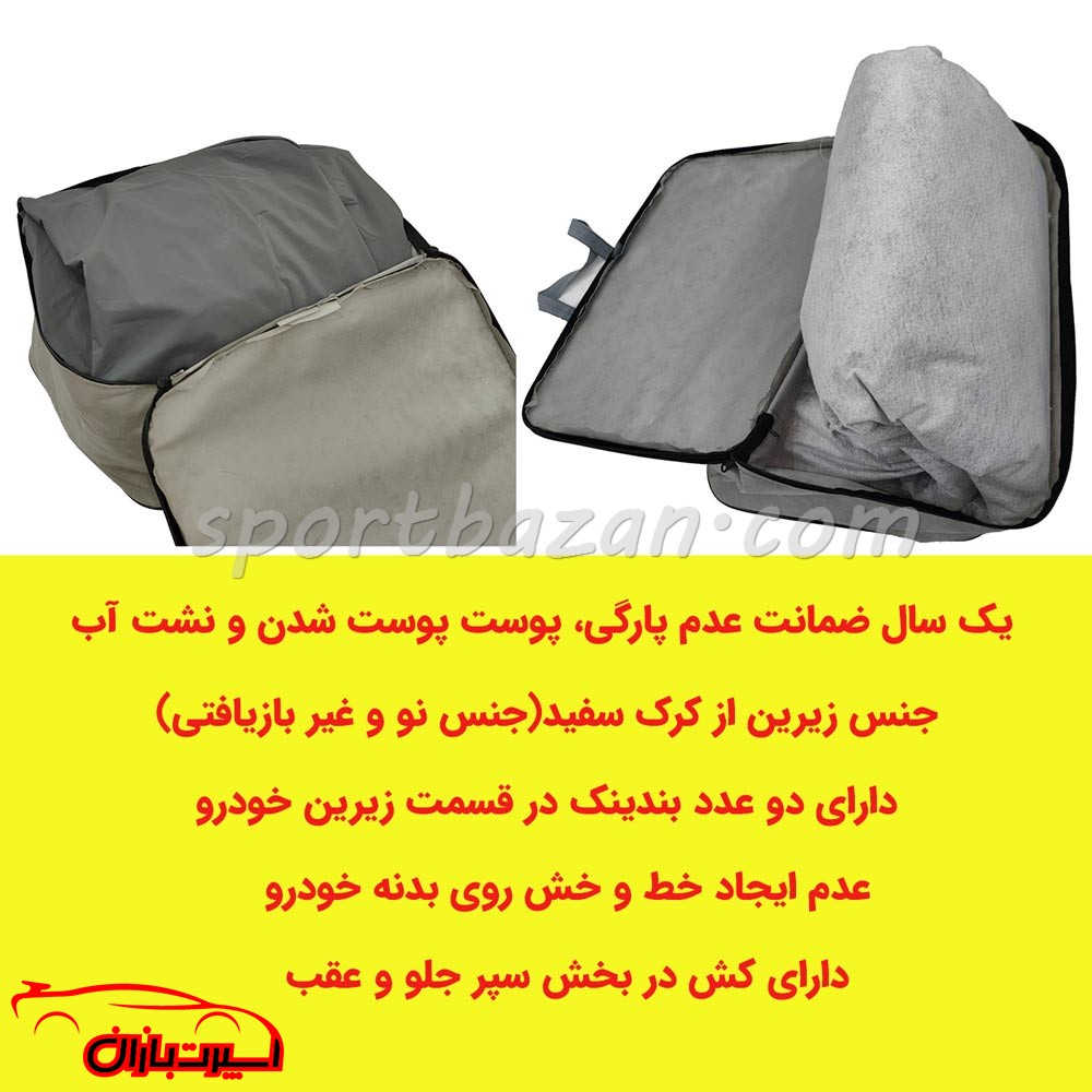 دارای دو عدد بندینک در قسمت زیرین خودرو, دارای کش در بخش سپر جلو و عقب, یک سال ضمانت عدم پارگی، پوست پوست شدن و نشت آب